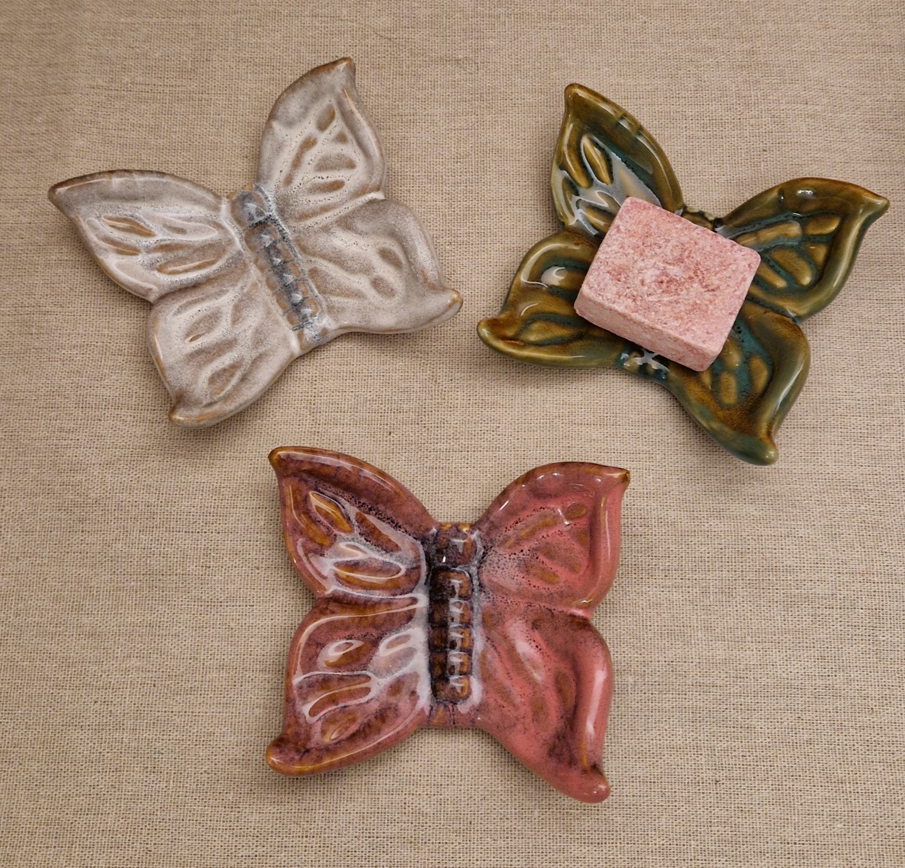 Sfeervol vlinderschaaltje van geglazuurd keramiek met een diameter van 10,21 cm. Verkrijgbaar in beige, groen en terra — perfect voor sieraden, sleutels of als decoratief accent.