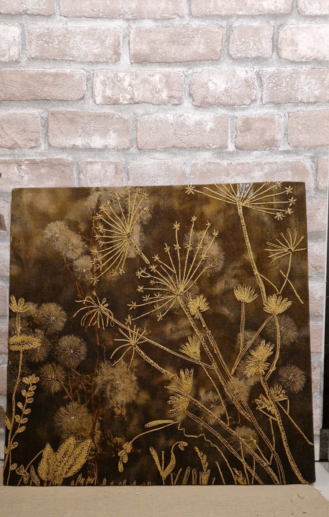 Stijlvolle wanddecoratie van 45 × 45 cm, geborduurd met goudkleurig draad. Het botanische ontwerp geeft een luxe en warme uitstraling aan ieder interieur. Perfect voor woonkamer, hal of slaapkamer.